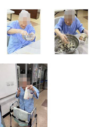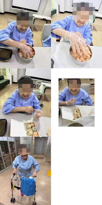 주먹밥 만드는 방법을 하나씩 설명드리고, 직접 모양을 빚으며 여러 재료를 섞어보기도 하자 점차 분위기가 밝아졌습니다. 처음에는 “혼자 먹을 거야”라고 말씀하시던 어르신들께서도 포장 용기에 담으며 옆 침대 어르신과 나누어 드시고, 간병사 선생님들과 함께 먹겠다며 정성껏 주먹밥을 만드시는 모습이 인상적이었습니다.