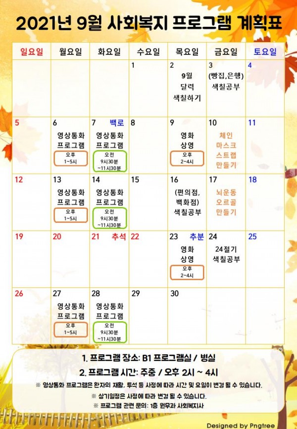 2021년 9월 사회복지 프로그램 계획표 페이지 정보 작성자 최고관리자 작성일21-09-01 14:40 조회9,251회 댓글0건 관련링크 이전글 다음글 본문 2021년 9월 사회복지 프로그램 계획표 입니다. ※배경 참고: pngtree.com 목록