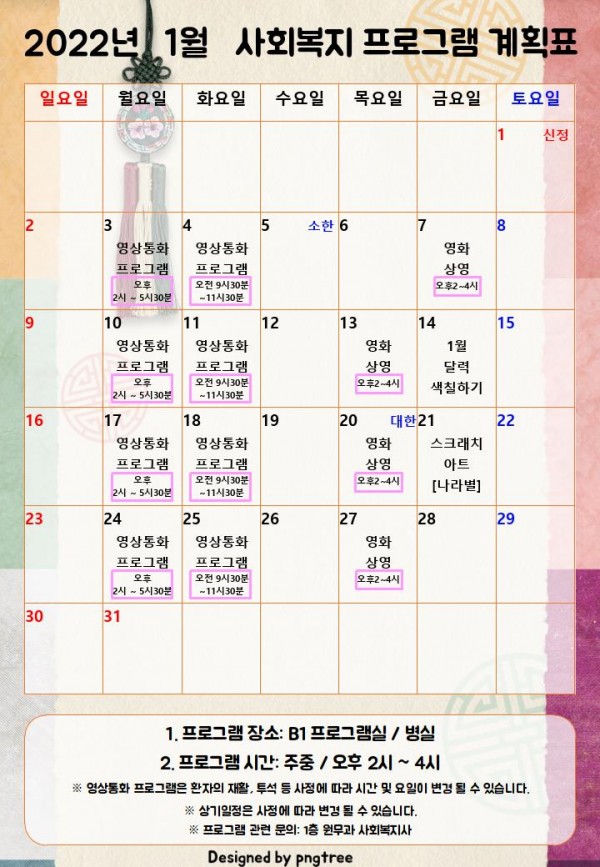 2022년 1월 사회복지 프로그램 계획표 페이지 정보 작성자 최고관리자 작성일22-01-14 11:32 조회9,640회 댓글0건 관련링크 이전글 다음글 본문 2022년 1월 사회복지 프로그램 계획표 입니다. ※배경 참고: pngtree.com 목록