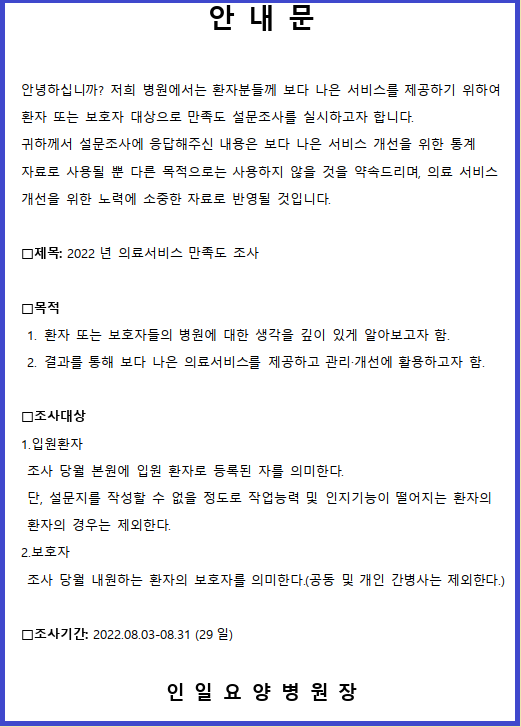 2022년 의료서비스 만족도 조사 안내문 페이지 정보 작성자 최고관리자 작성일22-08-03 10:49 조회8,384회 댓글0건 관련링크 이전글 다음글 본문 참여해주신 소중한 의견은 적극 반영하여 좀 더 나은 의료서비스에 활용하도록 하겠습니다. 목록