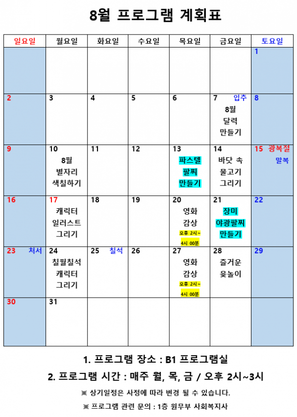 2020년 8월 사회복지 프로그램 계획표 페이지 정보 작성자 최고관리자 작성일20-08-10 16:22 조회9,838회 댓글0건 관련링크 이전글 다음글 본문 2020년 8월 사회복지 프로그램 계획표 입니다.^^ 목록