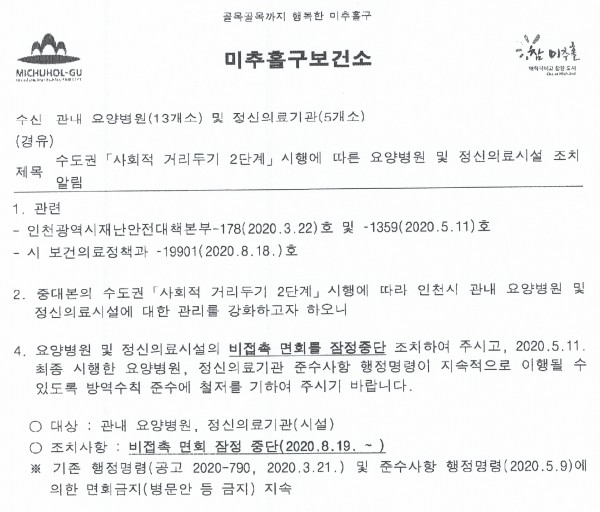 수도권 [사회적 거리두기 2단계] 시행에 따른 요양병원 및 정신의료시설 조치가 시행되었습니다.