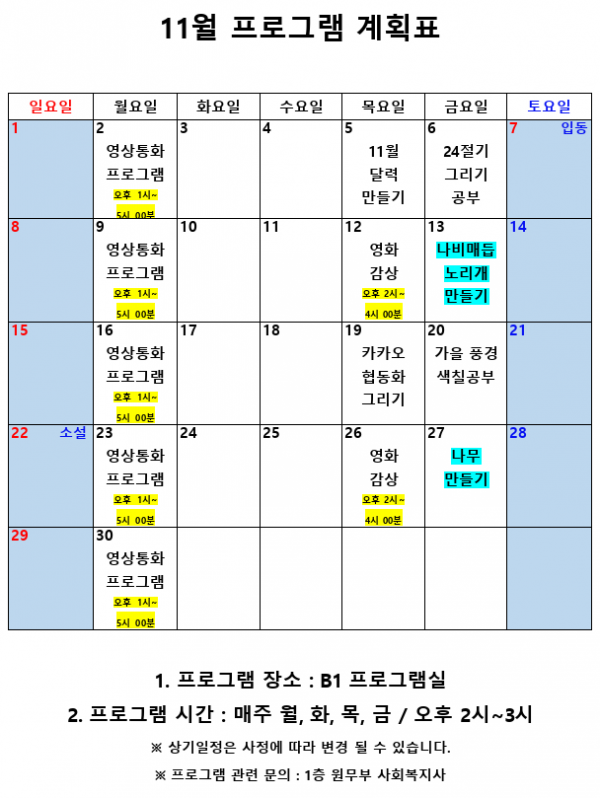 2020년 11월 사회복지 프로그램 계획표 페이지 정보 작성자 최고관리자 작성일20-11-06 15:42 조회9,810회 댓글0건 관련링크 이전글 다음글 본문 2020년 11월 사회복지 프로그램 계획표입니다. 목록