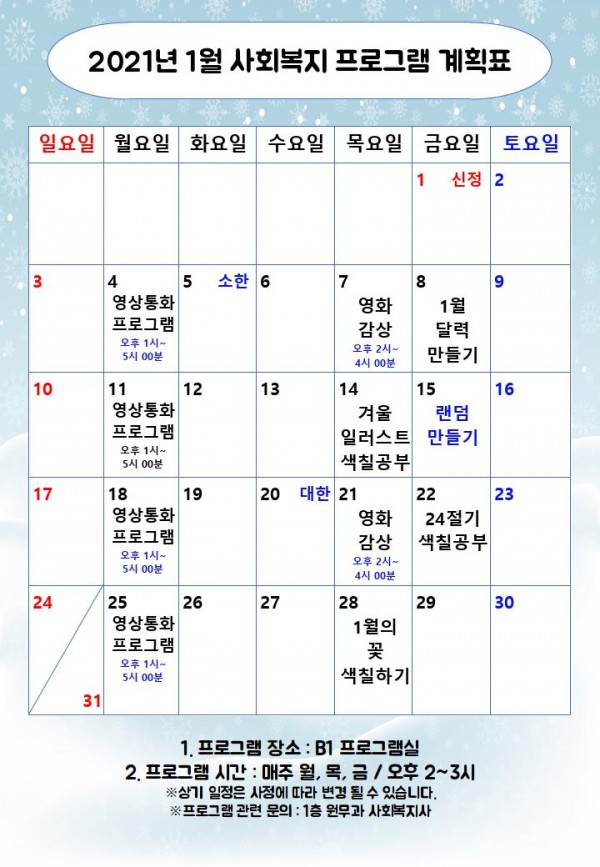 2021년 1월 사회복지 프로그램 계획표 페이지 정보 작성자 최고관리자 작성일21-01-04 13:12 조회9,992회 댓글0건 관련링크 이전글 다음글 본문 2021년 1월 사회복지 프로그램 계획표 입니다. 목록