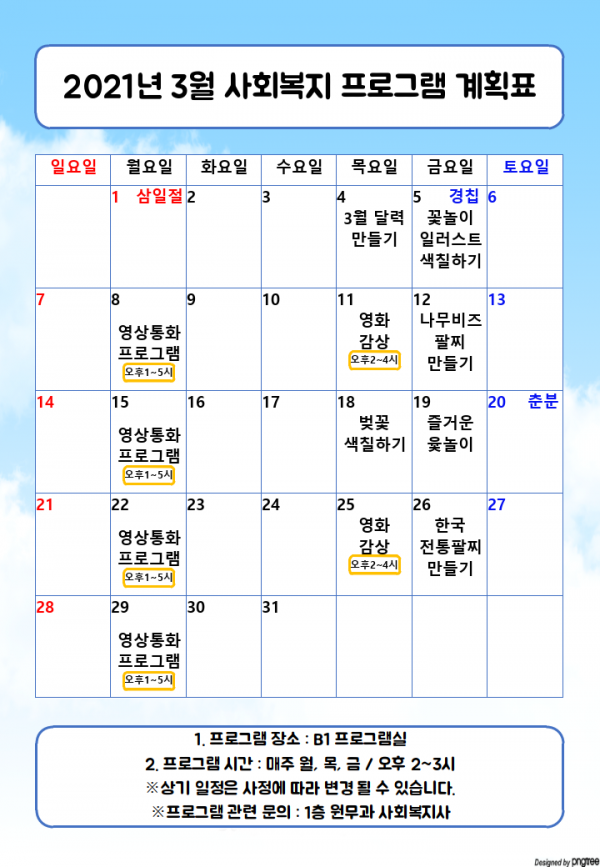 2021년 3월 사회복지 프로그램 계획표 페이지 정보 작성자 최고관리자 작성일21-03-02 10:31 조회9,801회 댓글0건 관련링크 이전글 다음글 본문 2021년 3월 사회복지 프로그램 계획표 입니다. ※배경 참고: pngtree.com 목록