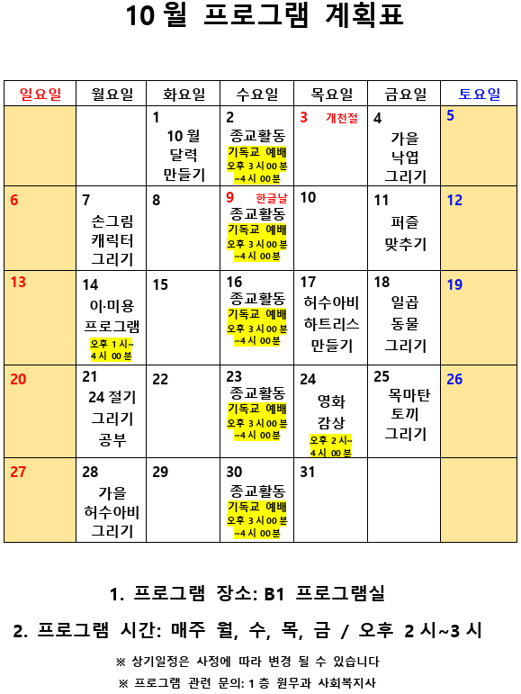 2019년 10월 사회복지 프로그램 계획표 페이지 정보 작성자 최고관리자 작성일19-10-01 15:49 조회9,750회 댓글0건 관련링크 이전글 다음글 본문 2019년 10월 사회복지 프로그램 계획표 입니다. 목록