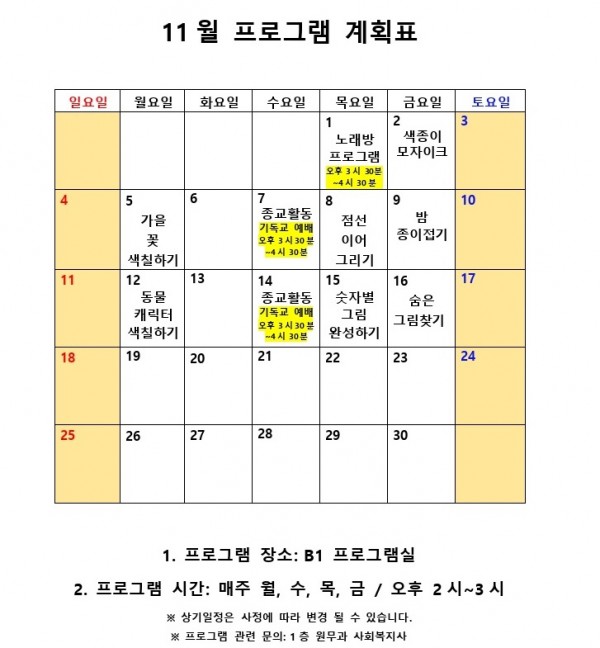11월 사회복지 프로그램 계획표 페이지 정보 작성자 최고관리자 작성일18-11-01 09:53 조회9,913회 댓글0건 관련링크 이전글 다음글 본문 11월 사회복지 프로그램 계획표 목록