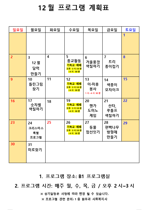 12월 사회복지 프로그램 계획표 페이지 정보 작성자 최고관리자 작성일18-11-30 17:24 조회10,561회 댓글0건 관련링크 이전글 다음글 본문 12월 사회복지 프로그램 계획표입니다^^ 목록