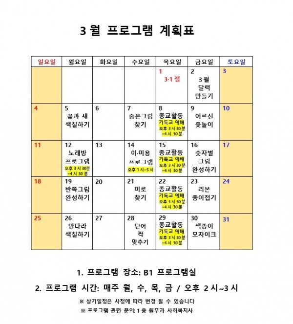 3월 사회복지 프로그램 계획표 페이지 정보 작성자 최고관리자 작성일18-04-05 13:30 조회10,012회 댓글0건 관련링크 이전글 다음글 본문 3월 사회복지 프로그램 계획표 목록
