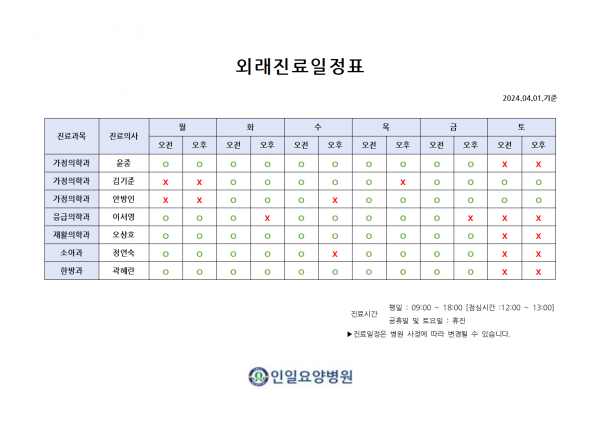 2024년 4월 외래진료 일정표 페이지 정보 작성자 최고관리자 작성일24-04-01 14:41 조회6,999회 댓글0건 관련링크 이전글 다음글 본문 **2024년 4월 외래진료 일정표 목록