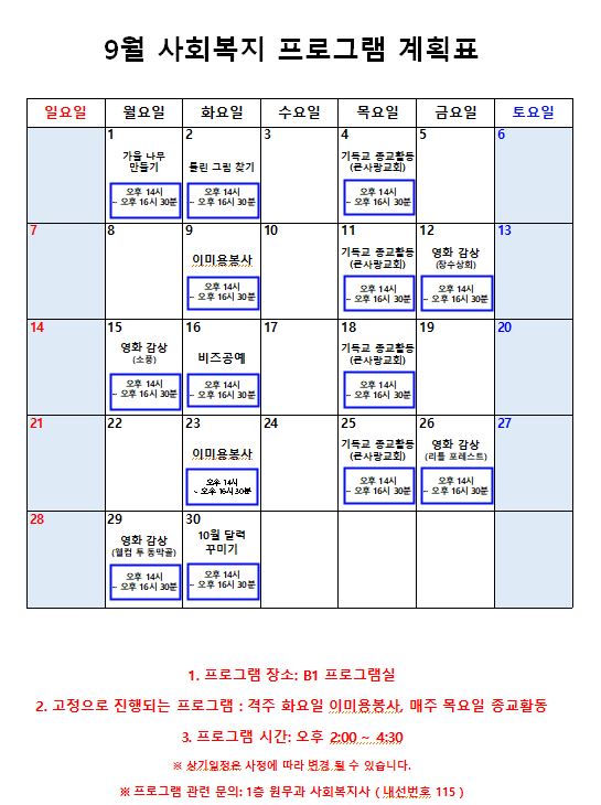 2025년 9월 프로그램 계획표 페이지 정보 작성자 최고관리자 작성일25-09-01 13:00 조회1,977회 댓글0건 관련링크 이전글 다음글 본문 2025년 9월 프로그램 계획표입니다. 감사합니다. 목록